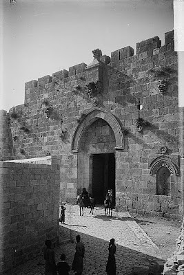 Zion Gate, picture by Bergheim, circa 1867.  Today, the walls are pock-marked from